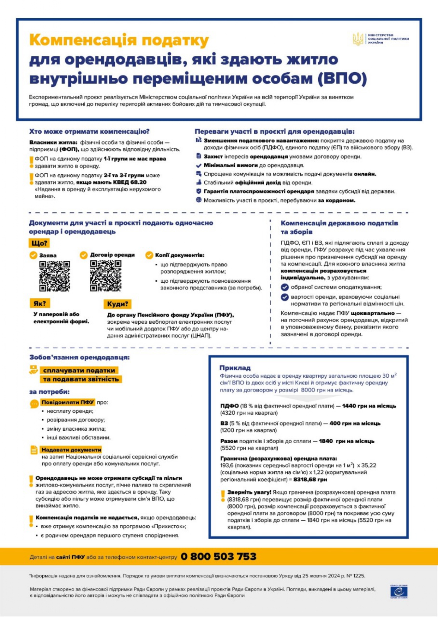 29 січня 2025 року набула чинності постанова Кабінету Міністрів України від 25 жовтня 2024 року № 1225 «Про реалізацію експериментального проекту щодо надання субсидії на оплату вартості або частини вартості найму (оренди) житлового приміщення та компенсації частини податку на доходи фізичних осіб або єдиного податку та військового збору», якою запроваджено: